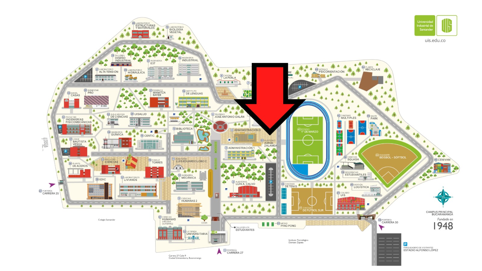 El evento se realizará en el auditorio Jorge Zalamea. La ubicación del auditorio en el campus se muestra a continuación: